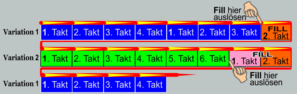 Stellen wir uns ein Musikstück mit 8-taktigen Liedteilen vor. Für einen bestimmten Abschnitt benötigen wir 2 Variationen, die mit Fills verbunden sein sollen.