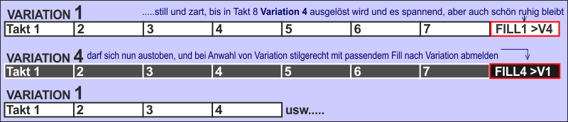 | YAMAHA und KORG (in den neueren) bieten zur Überleitung zwischen einzelnen VARIATIONen jeweils nur vier fest zu einzelnen Variationen gehörende FILLs an. | |